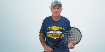 These days Jon lives in Nevada City with his wife Lee Ann. He has three grown children, all very talented artists, and a grandson who is growing up fast! When not playing or coaching tennis, his favorite activity is walking the trails with his appropriately named dog, Sierra.